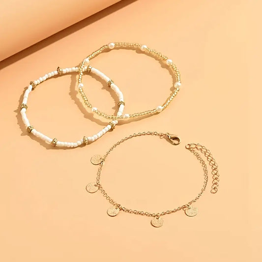 Zestaw wielowarstwowych bransoletek na kostkę Coastal Charm 3 szt. | Złoto